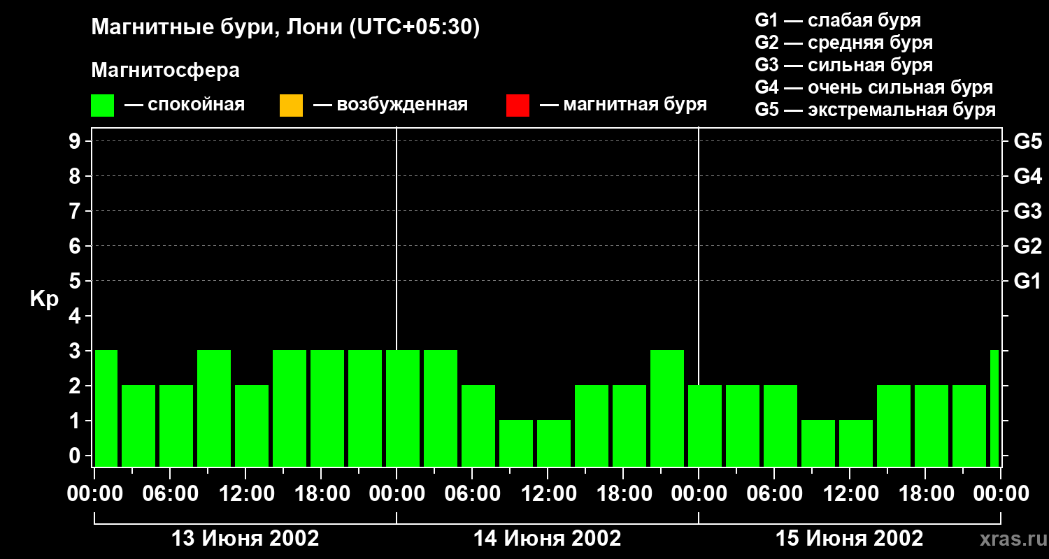 Изменения геомагнитного индекса Kp с 13 по 15 июня 2002 года для средних широт