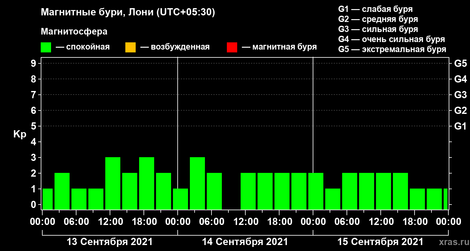 Изменения геомагнитного индекса Kp с 13 по 15 сентября 2021 года для средних широт