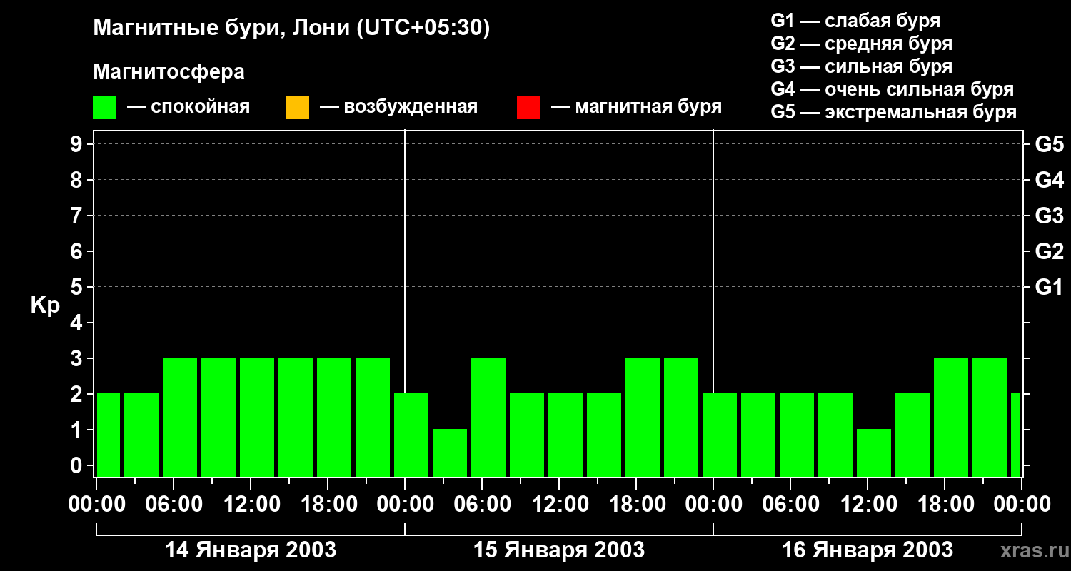 Изменения геомагнитного индекса Kp с 14 по 16 января 2003 года для средних широт