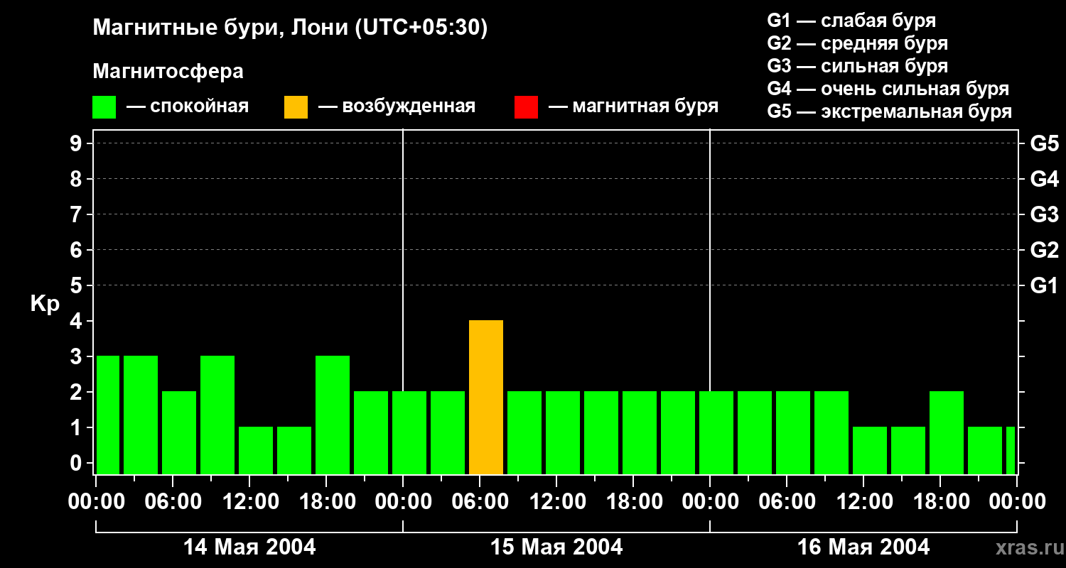 Изменения геомагнитного индекса Kp с 14 по 16 мая 2004 года для средних широт