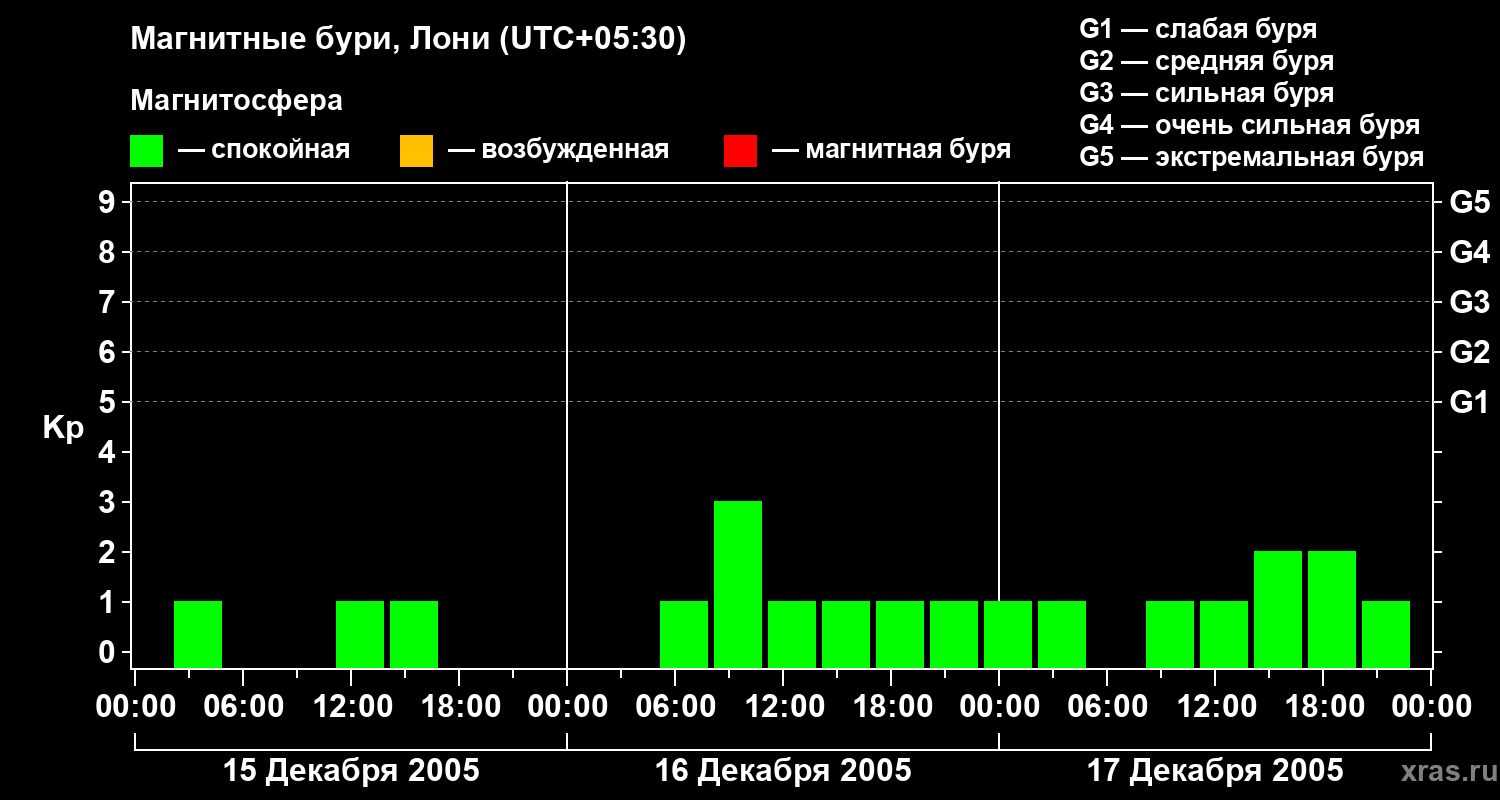 Изменения геомагнитного индекса Kp с 15 по 17 декабря 2005 года для средних широт