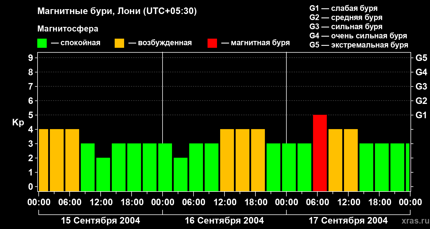 Изменения геомагнитного индекса Kp с 15 по 17 сентября 2004 года для средних широт