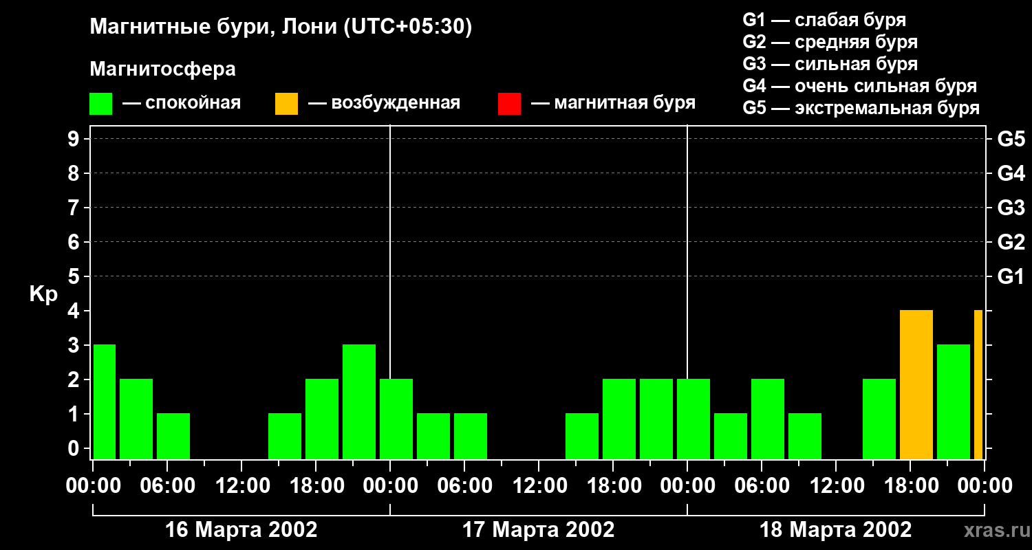 Изменения геомагнитного индекса Kp с 16 по 18 марта 2002 года для средних широт