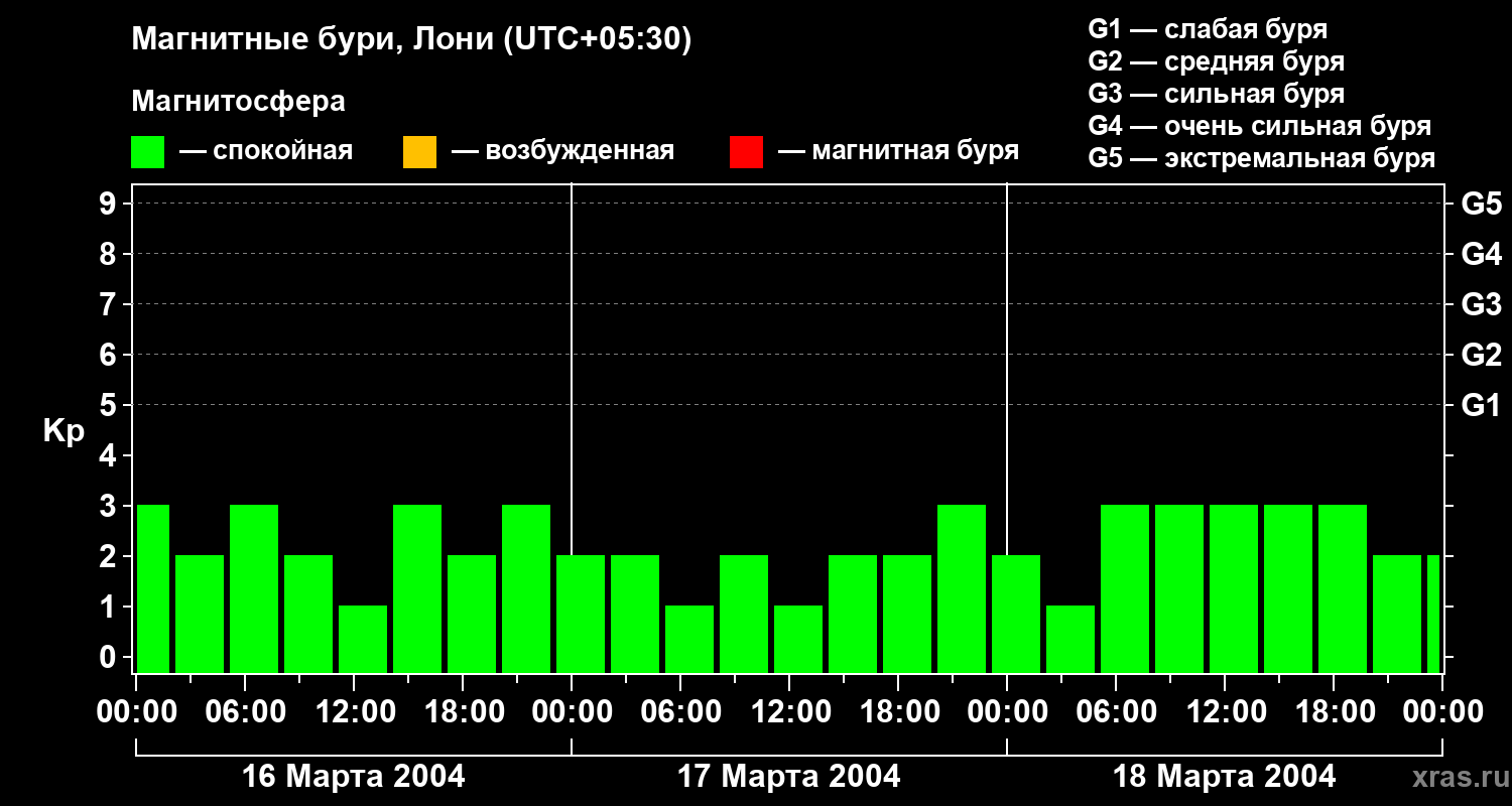 Изменения геомагнитного индекса Kp с 16 по 18 марта 2004 года для средних широт