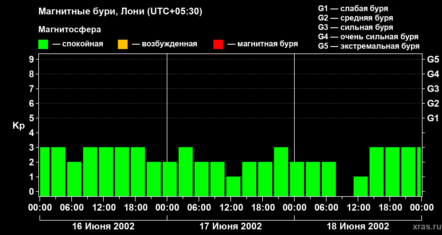 Изменения геомагнитного индекса Kp с 16 по 18 июня 2002 года для средних широт