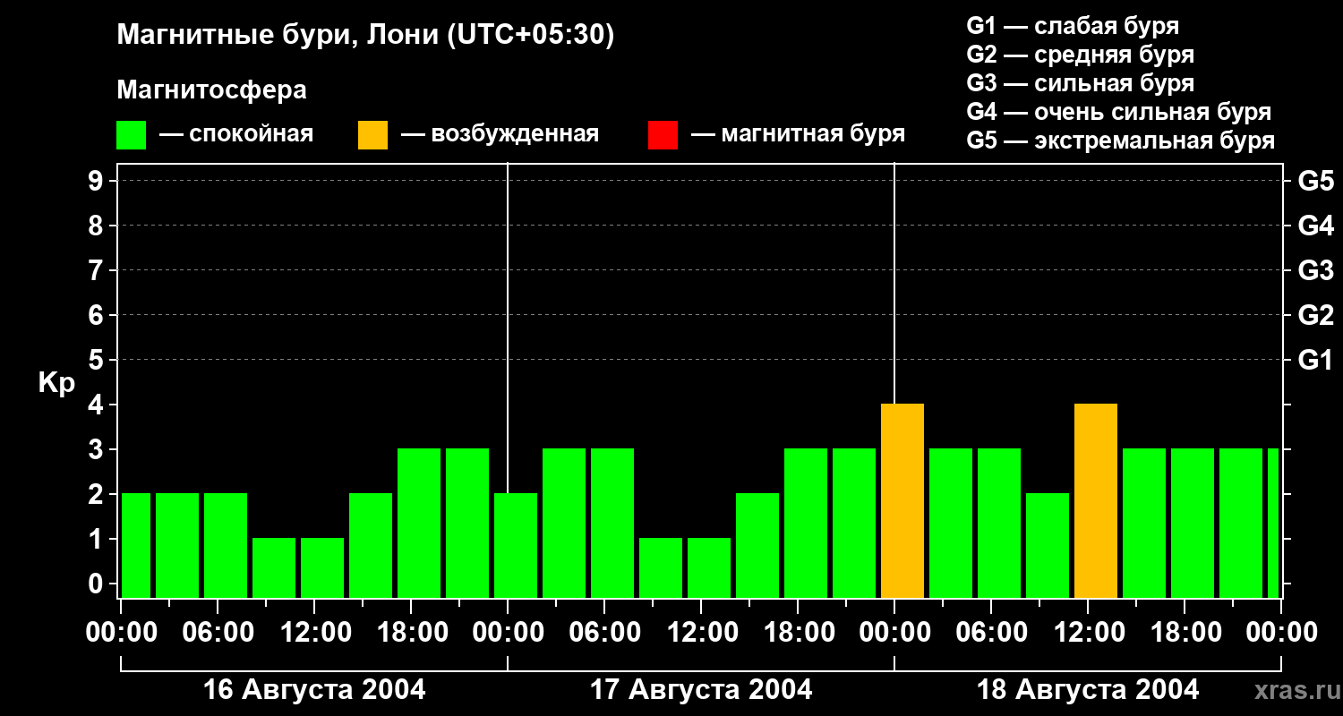 Изменения геомагнитного индекса Kp с 16 по 18 августа 2004 года для средних широт