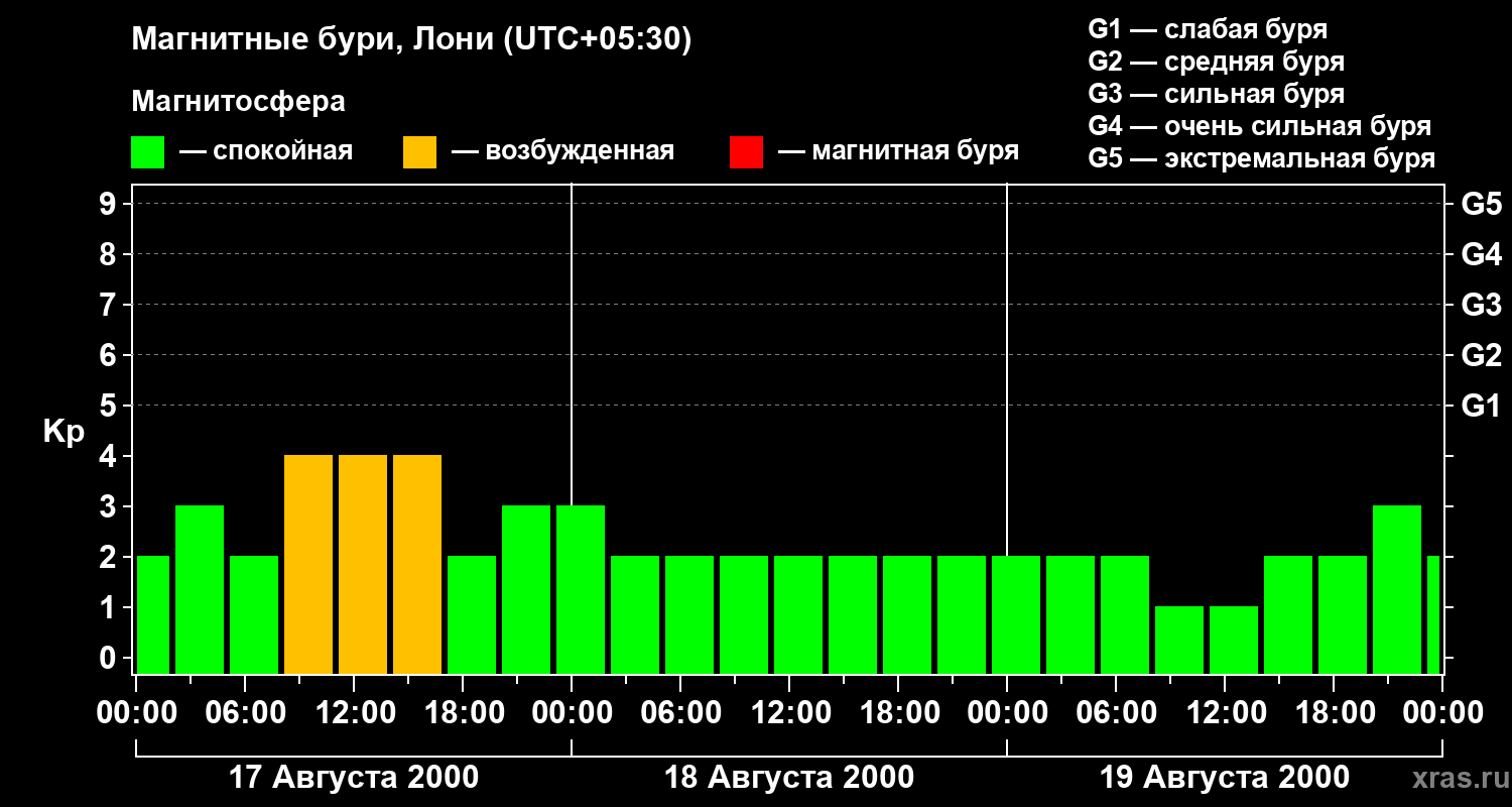 Изменения геомагнитного индекса Kp с 17 по 19 августа 2000 года для средних широт