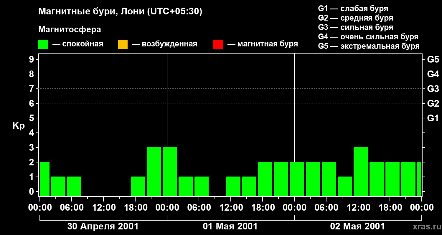 Изменения геомагнитного индекса Kp с 30 апреля по 2 мая 2001 года для средних широт