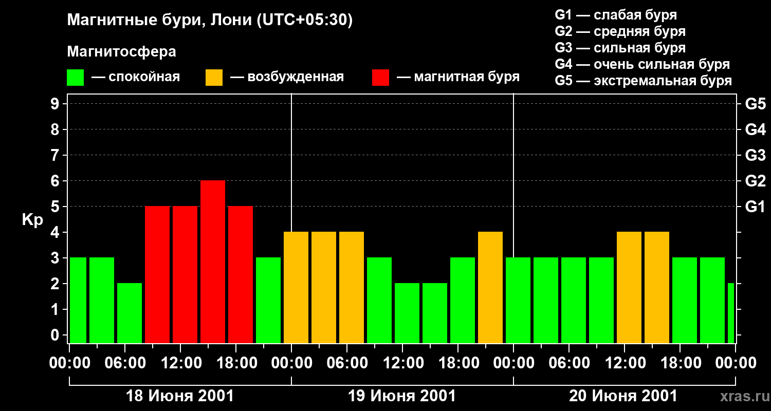 Изменения геомагнитного индекса Kp с 18 по 20 июня 2001 года для средних широт