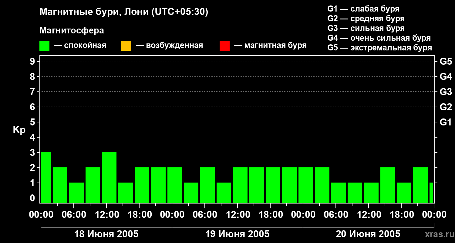 Изменения геомагнитного индекса Kp с 18 по 20 июня 2005 года для средних широт
