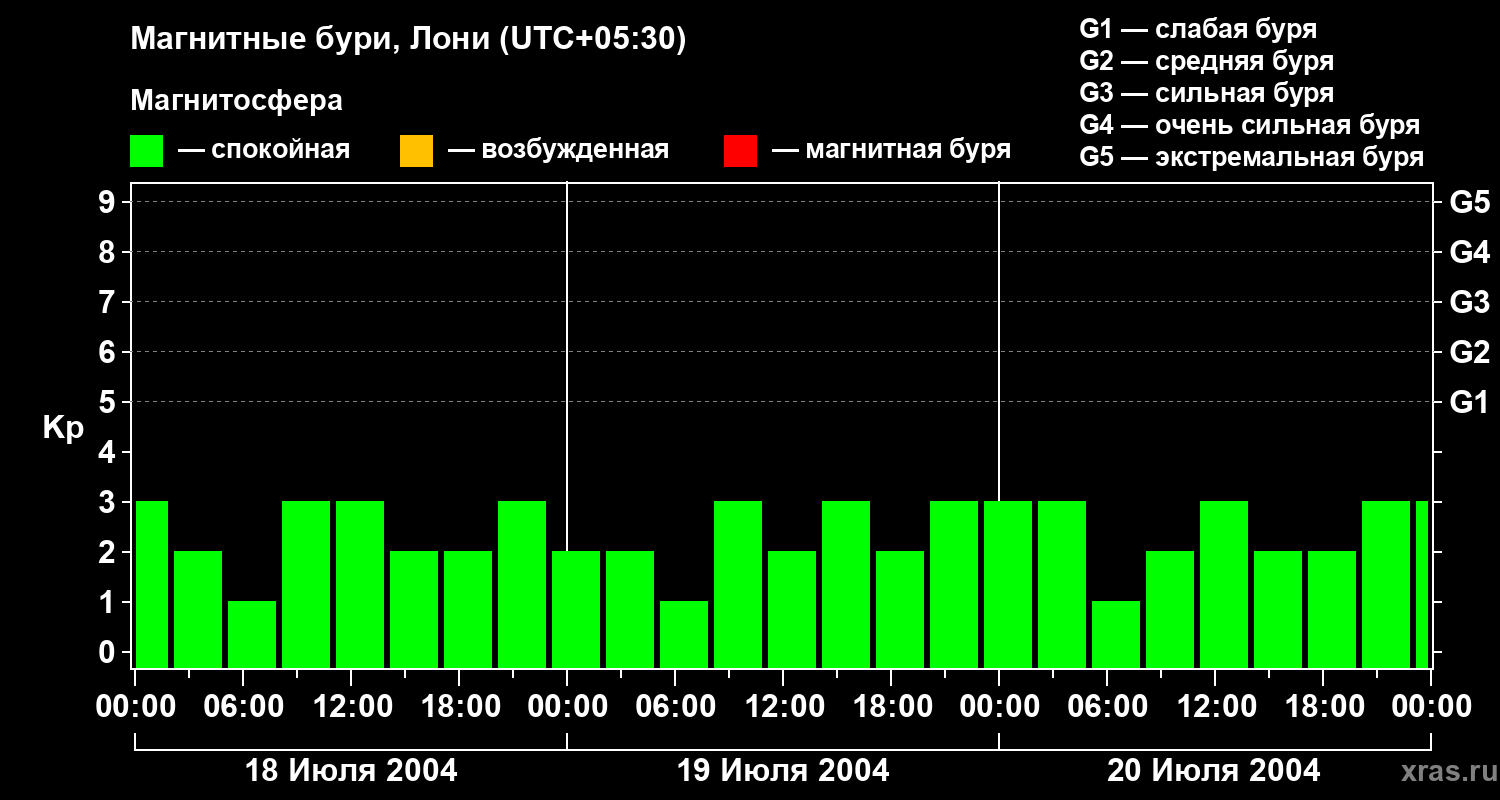 Изменения геомагнитного индекса Kp с 18 по 20 июля 2004 года для средних широт