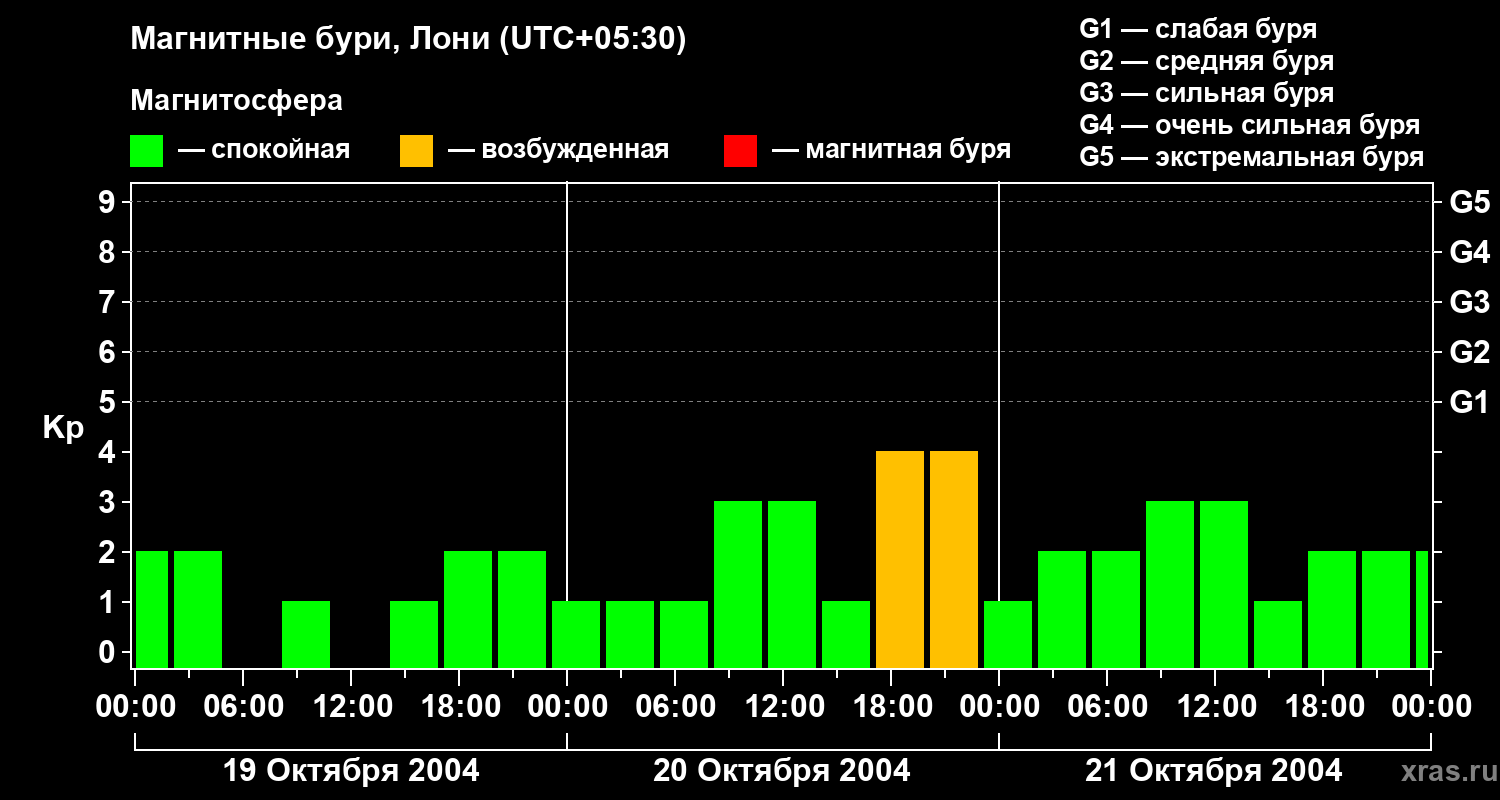 Изменения геомагнитного индекса Kp с 19 по 21 октября 2004 года для средних широт