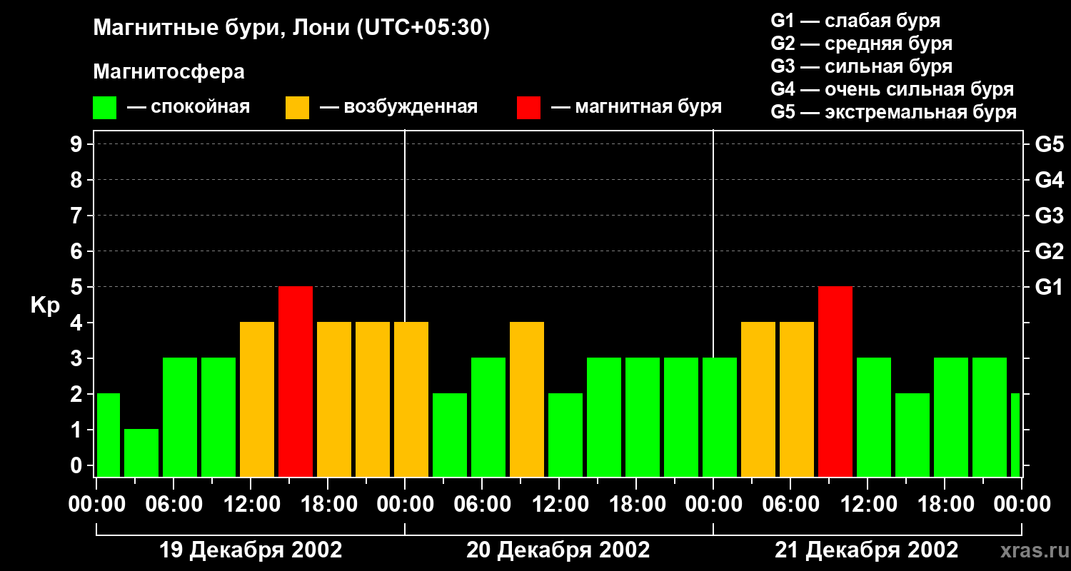 Изменения геомагнитного индекса Kp с 19 по 21 декабря 2002 года для средних широт