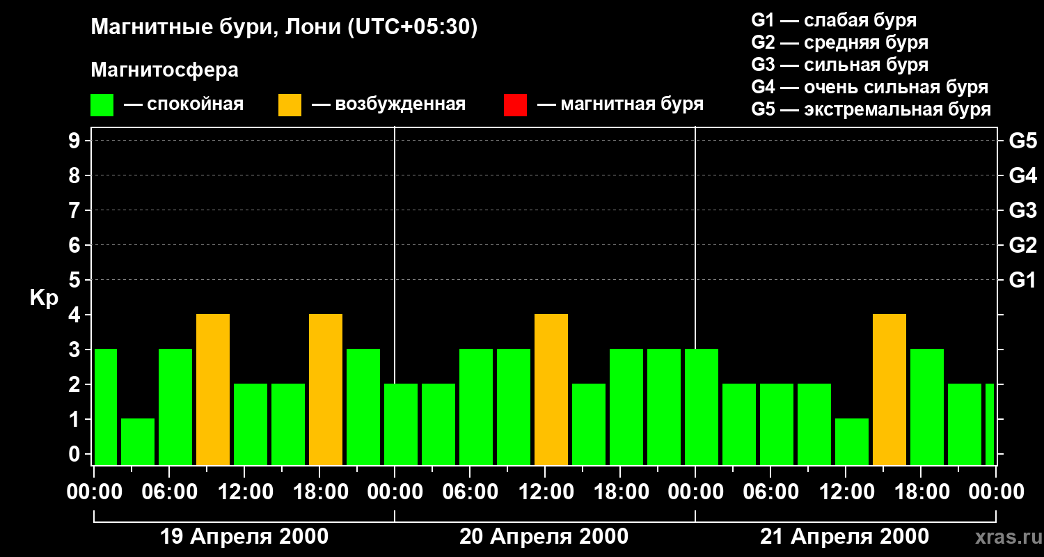 Изменения геомагнитного индекса Kp с 19 по 21 апреля 2000 года для средних широт