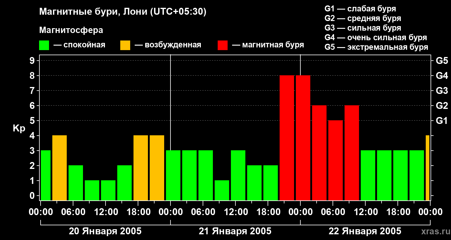 Изменения геомагнитного индекса Kp с 20 по 22 января 2005 года для средних широт