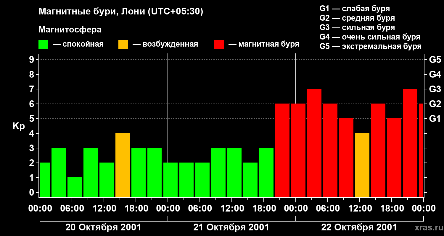 Изменения геомагнитного индекса Kp с 20 по 22 октября 2001 года для средних широт