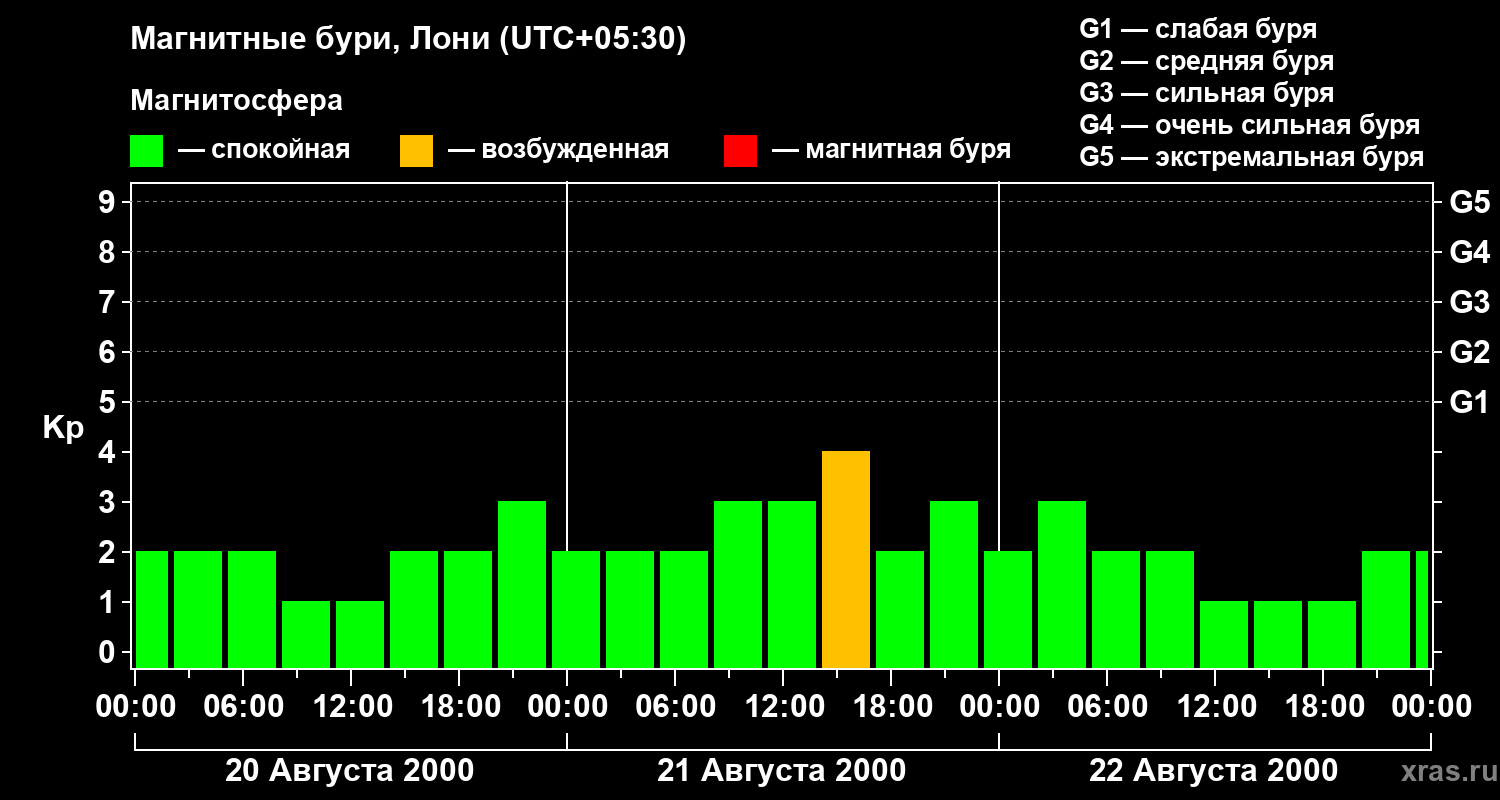 Изменения геомагнитного индекса Kp с 20 по 22 августа 2000 года для средних широт