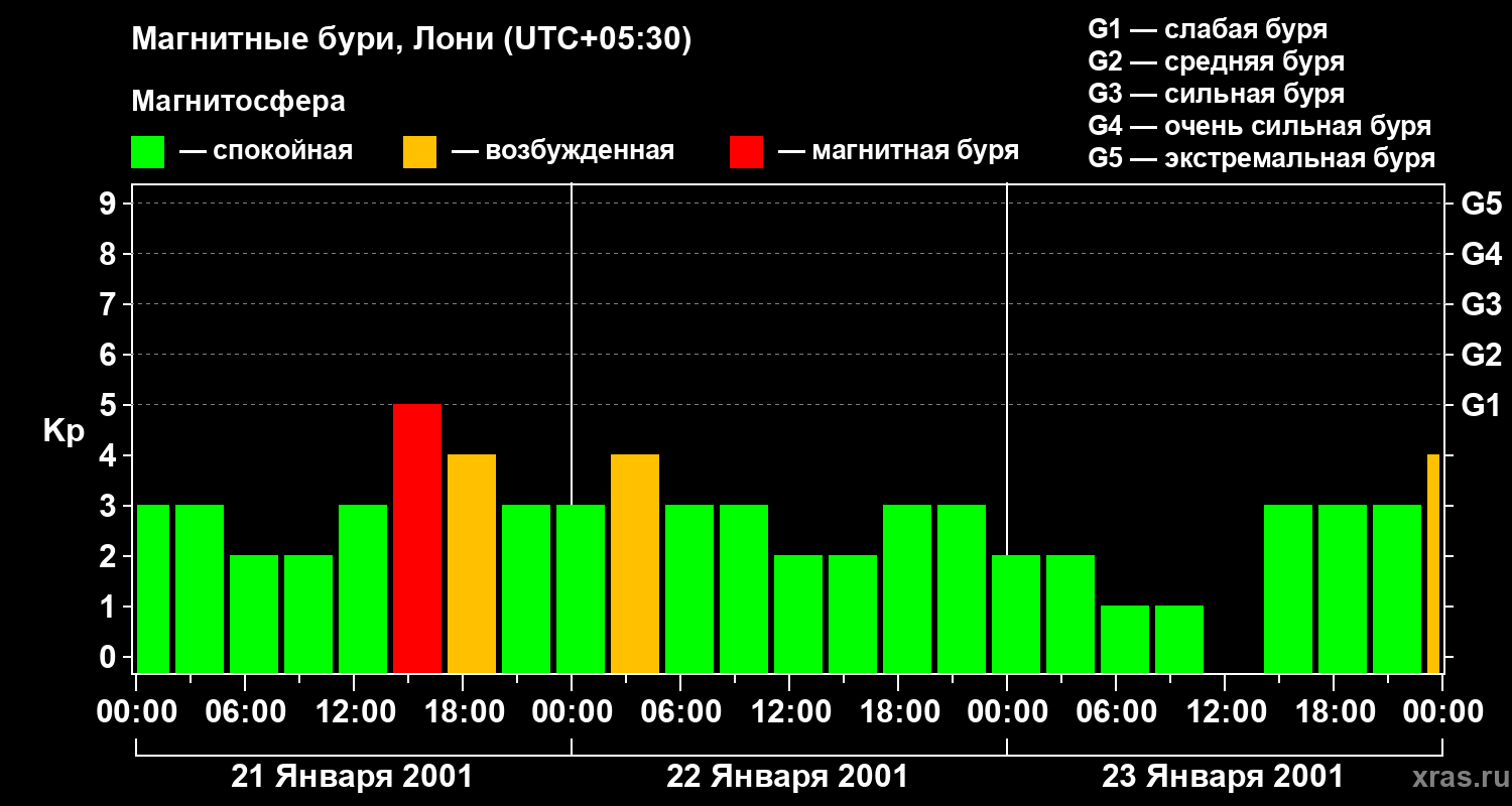 Изменения геомагнитного индекса Kp с 21 по 23 января 2001 года для средних широт