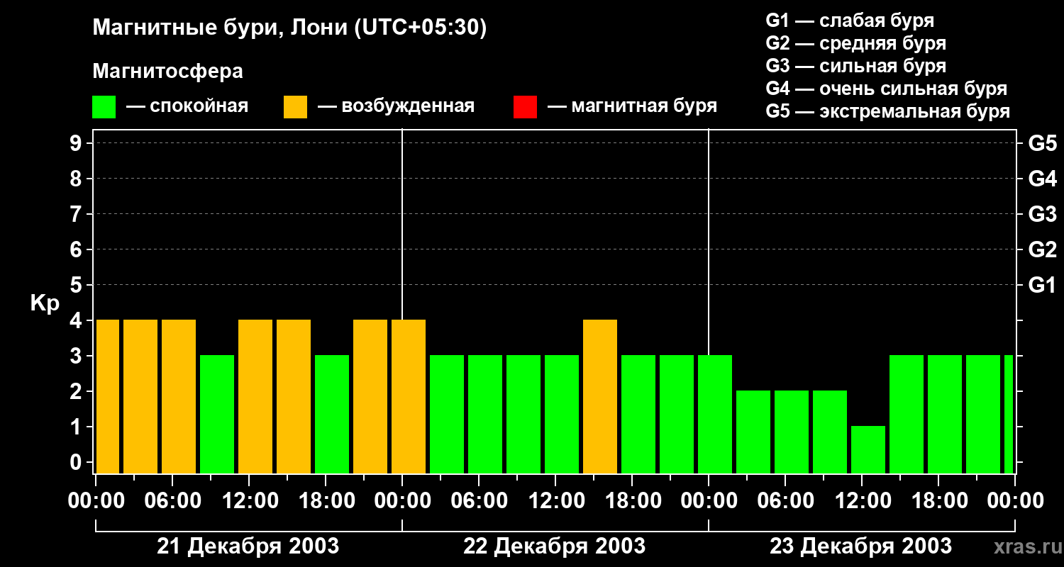 Изменения геомагнитного индекса Kp с 21 по 23 декабря 2003 года для средних широт