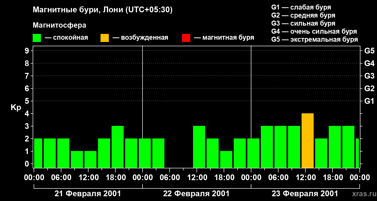 Изменения геомагнитного индекса Kp с 21 по 23 февраля 2001 года для средних широт