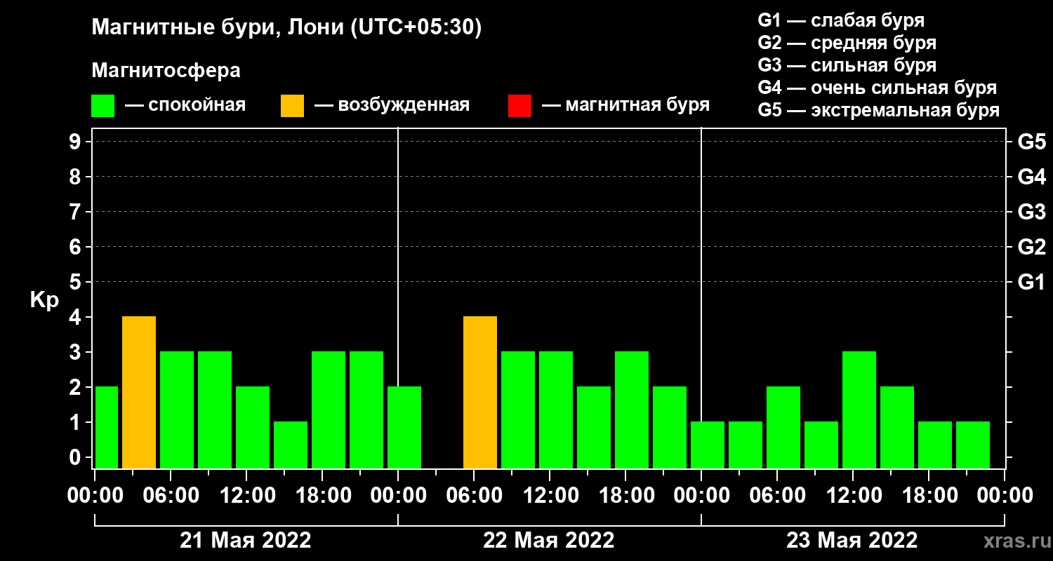 Изменения геомагнитного индекса Kp с 21 по 23 мая 2022 года для средних широт