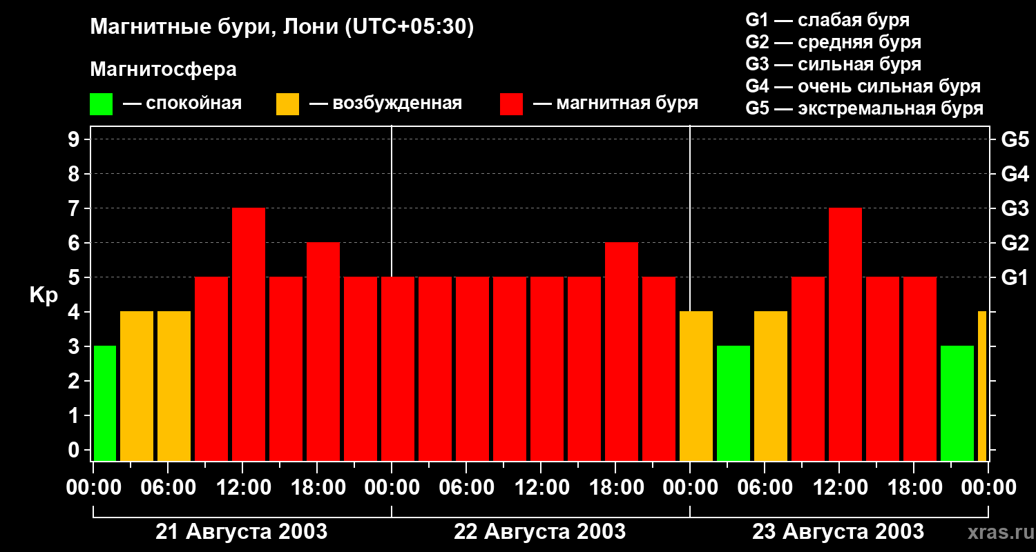 Изменения геомагнитного индекса Kp с 21 по 23 августа 2003 года для средних широт