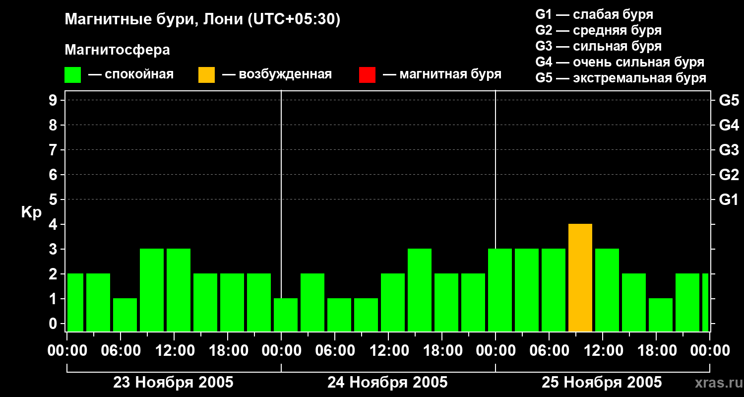 Изменения геомагнитного индекса Kp с 23 по 25 ноября 2005 года для средних широт
