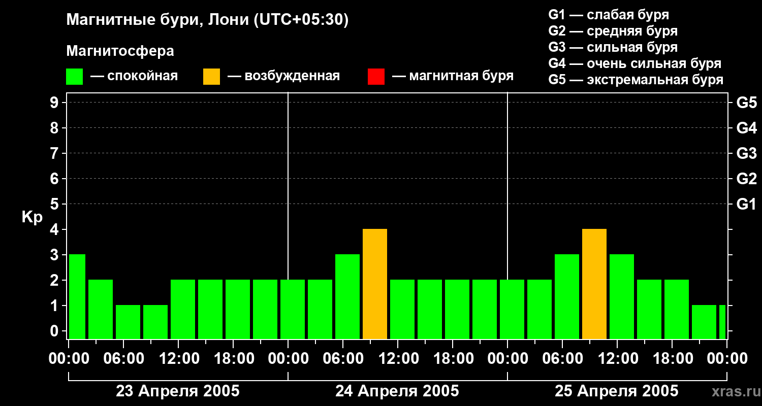 Изменения геомагнитного индекса Kp с 23 по 25 апреля 2005 года для средних широт