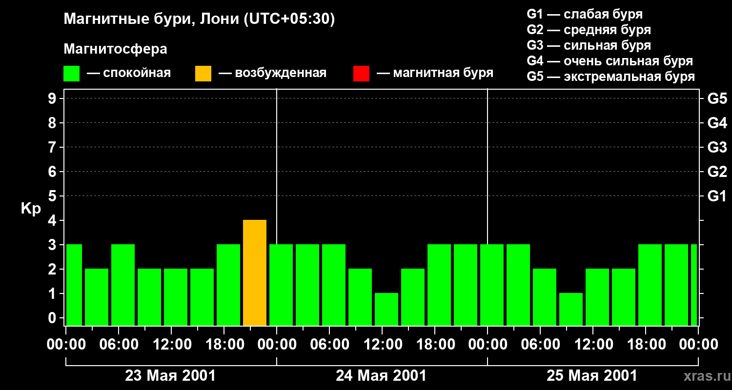 Изменения геомагнитного индекса Kp с 23 по 25 мая 2001 года для средних широт