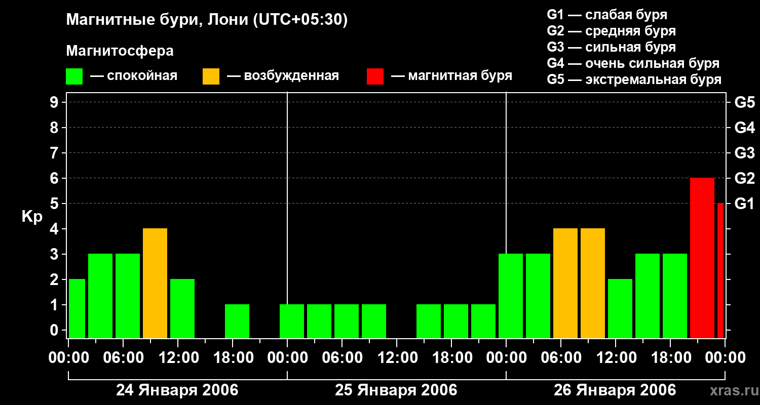 Изменения геомагнитного индекса Kp с 24 по 26 января 2006 года для средних широт