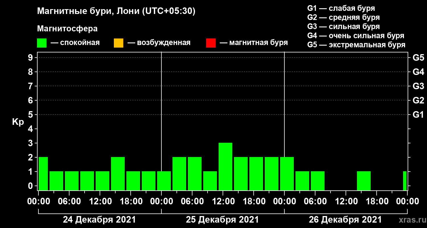 Изменения геомагнитного индекса Kp с 24 по 26 декабря 2021 года для средних широт