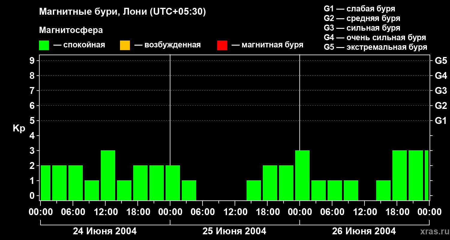 Изменения геомагнитного индекса Kp с 24 по 26 июня 2004 года для средних широт