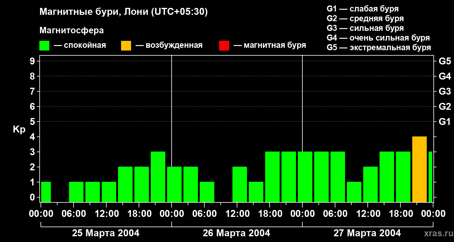 Изменения геомагнитного индекса Kp с 25 по 27 марта 2004 года для средних широт