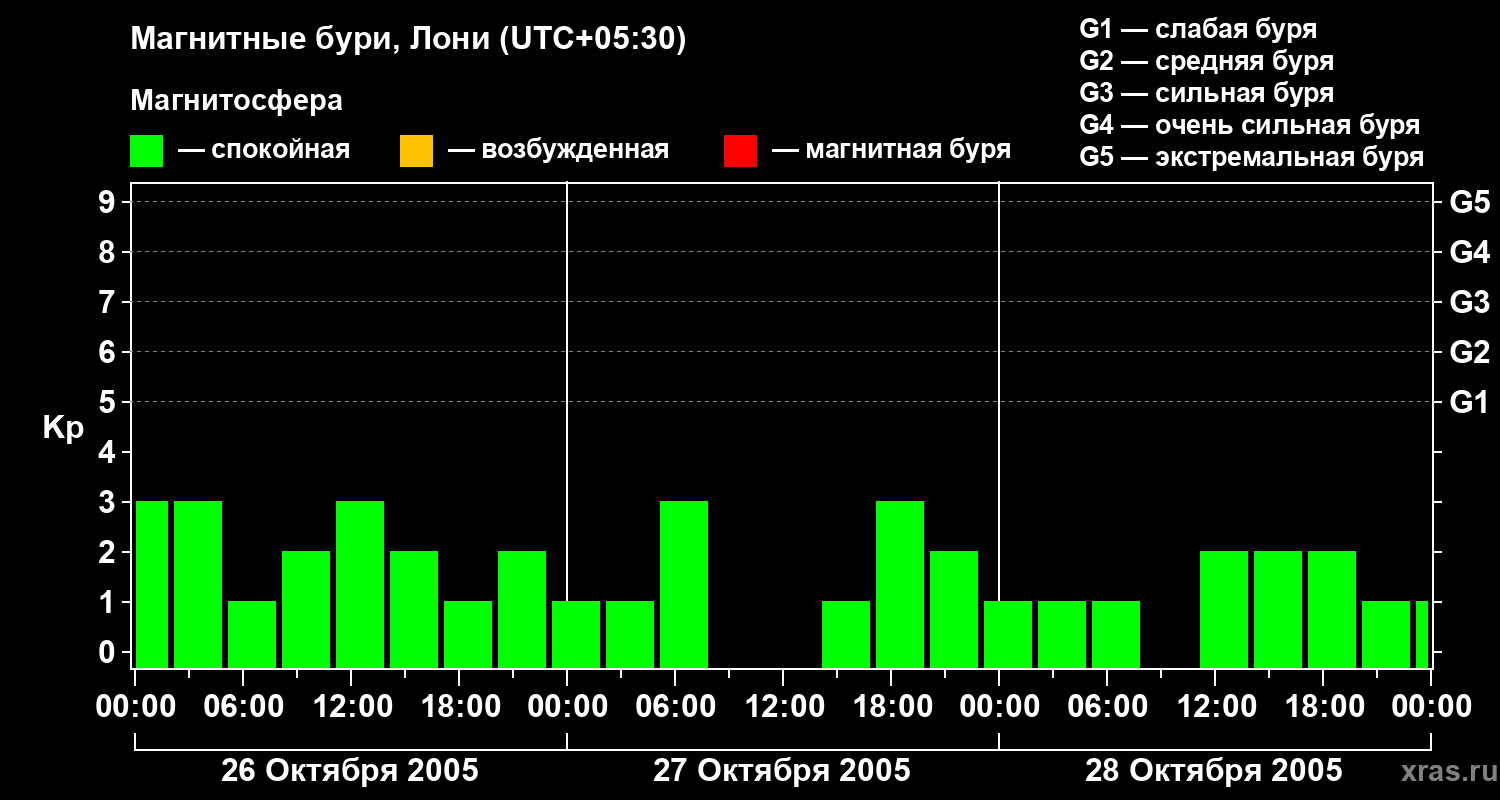 Изменения геомагнитного индекса Kp с 26 по 28 октября 2005 года для средних широт