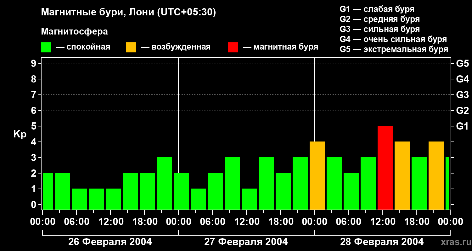Изменения геомагнитного индекса Kp с 26 по 28 февраля 2004 года для средних широт