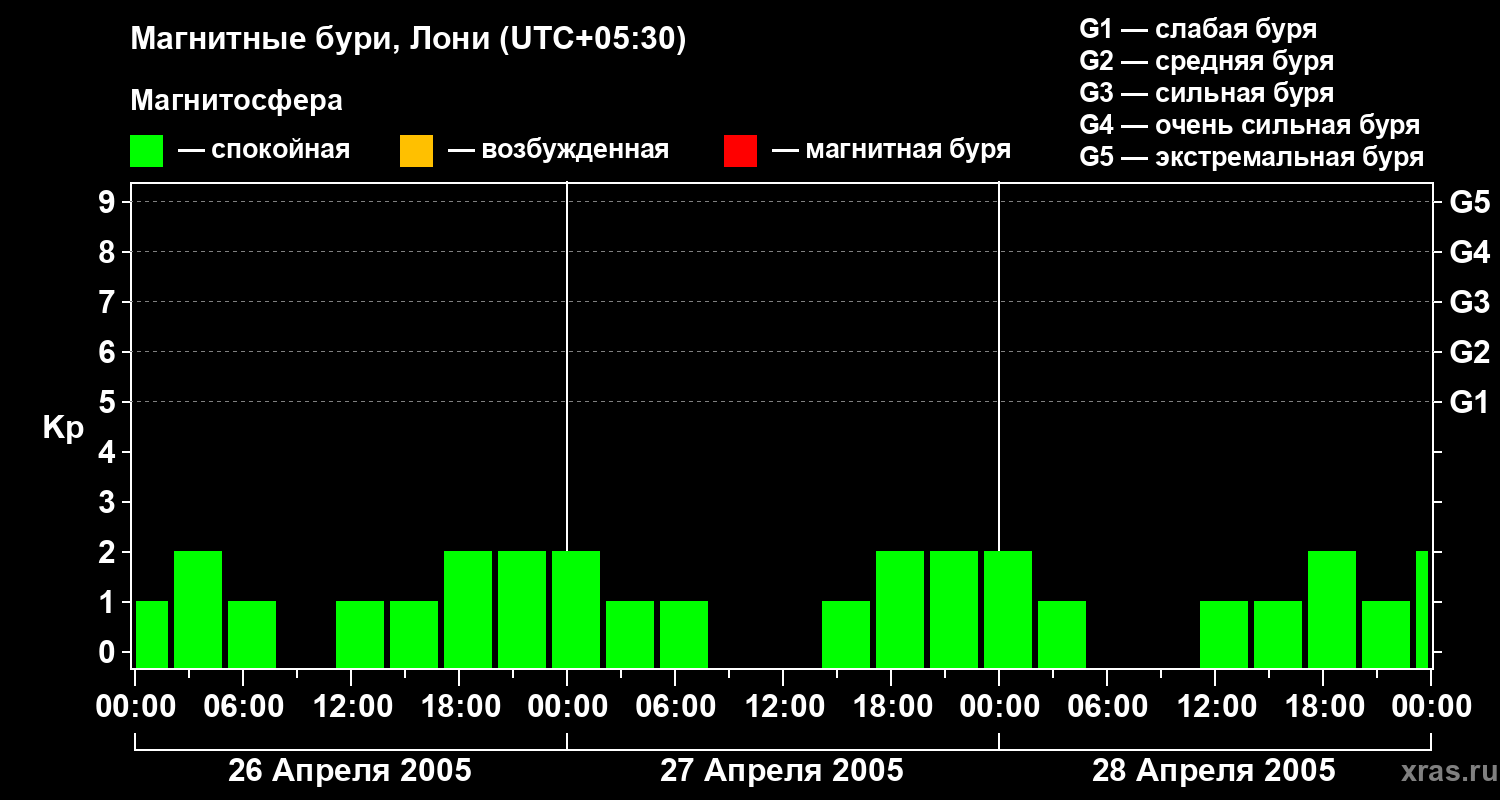 Изменения геомагнитного индекса Kp с 26 по 28 апреля 2005 года для средних широт