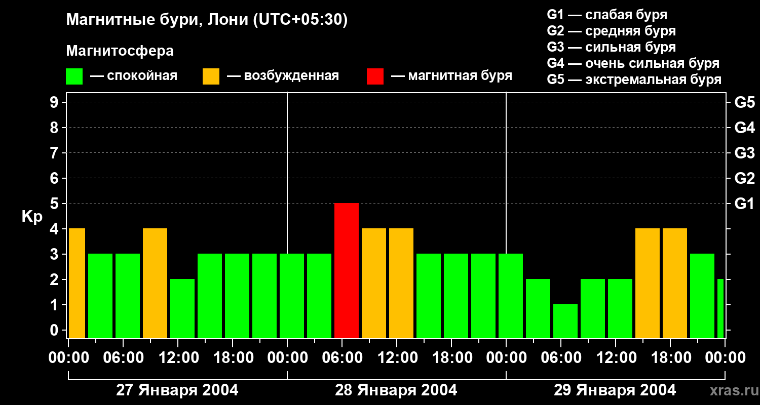 Изменения геомагнитного индекса Kp с 27 по 29 января 2004 года для средних широт