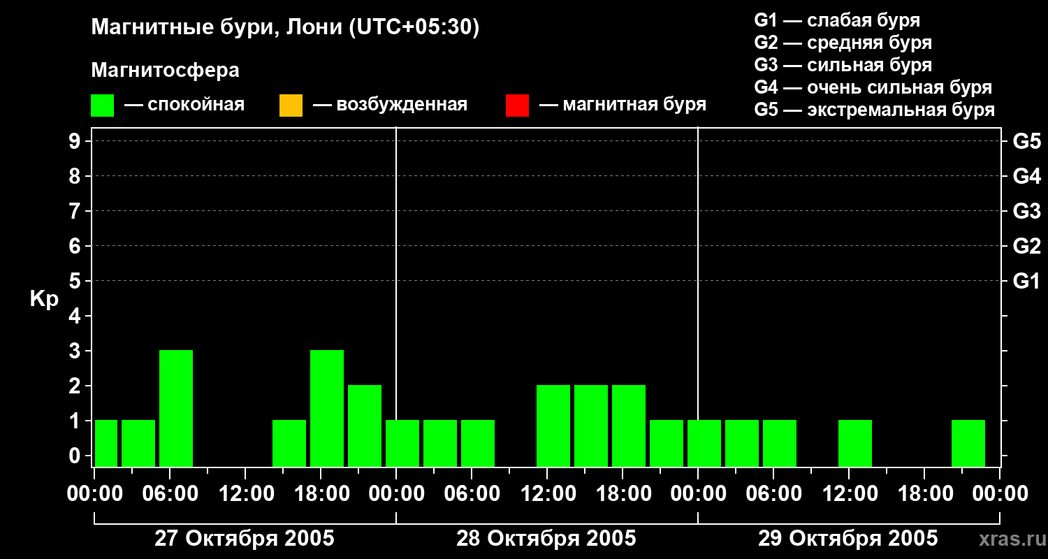 Изменения геомагнитного индекса Kp с 27 по 29 октября 2005 года для средних широт