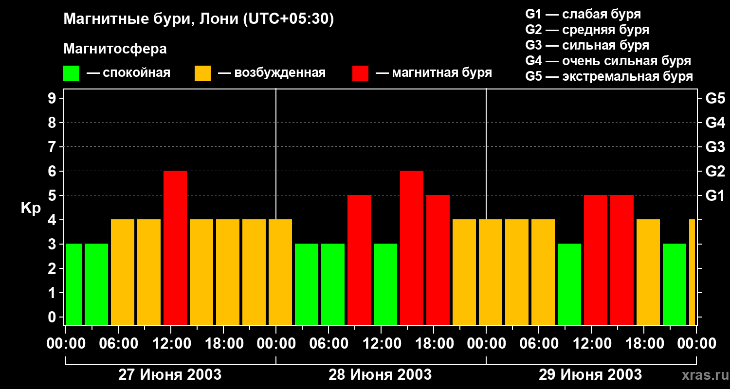 Изменения геомагнитного индекса Kp с 27 по 29 июня 2003 года для средних широт