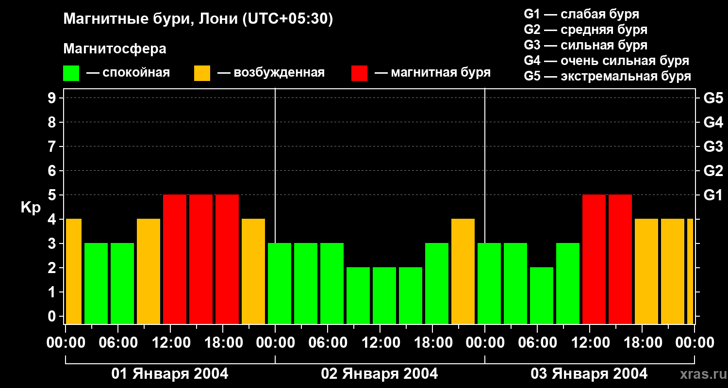 Изменения геомагнитного индекса Kp с 1 по 3 января 2004 года для средних широт