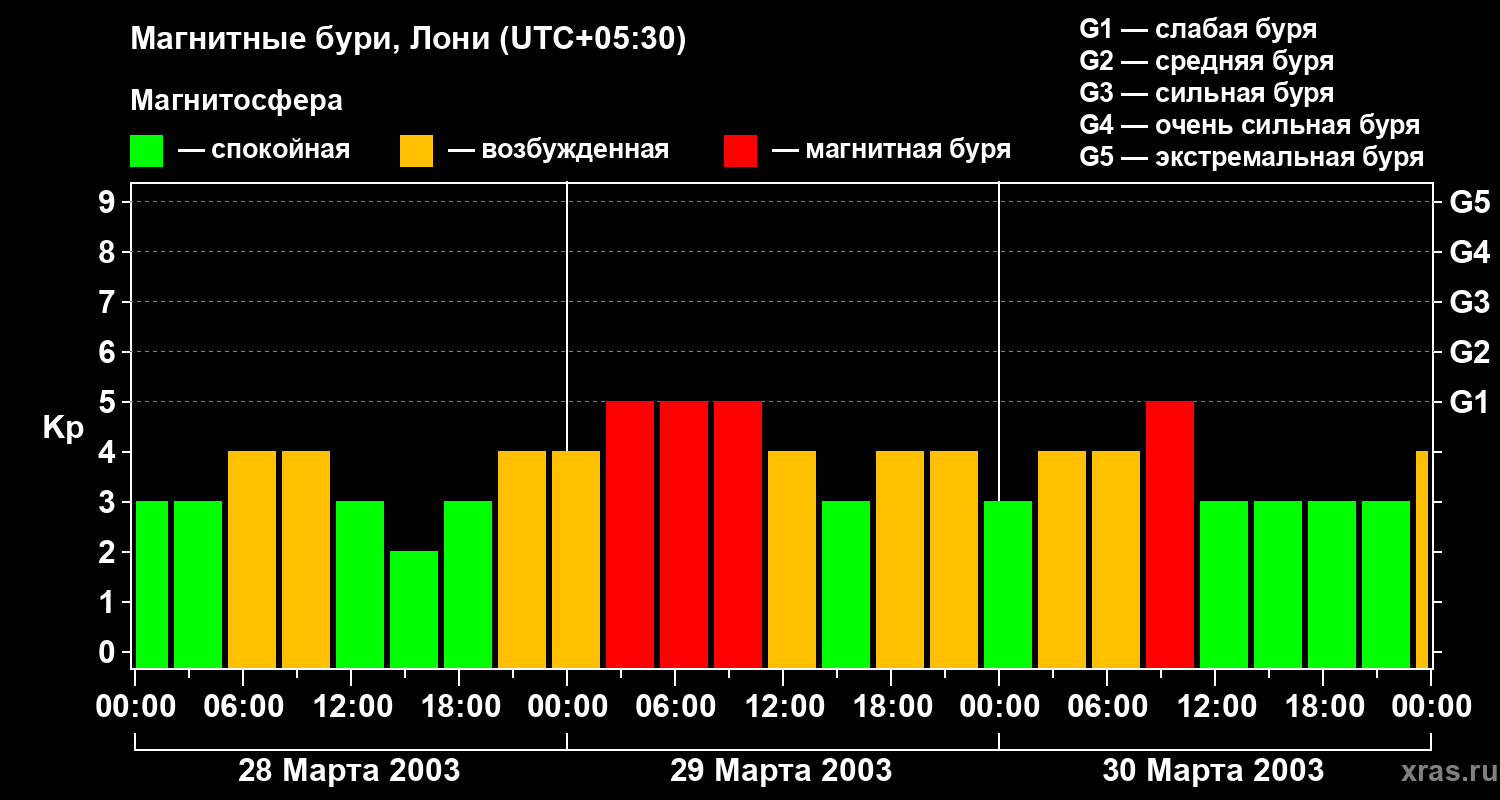 Изменения геомагнитного индекса Kp с 28 по 30 марта 2003 года для средних широт