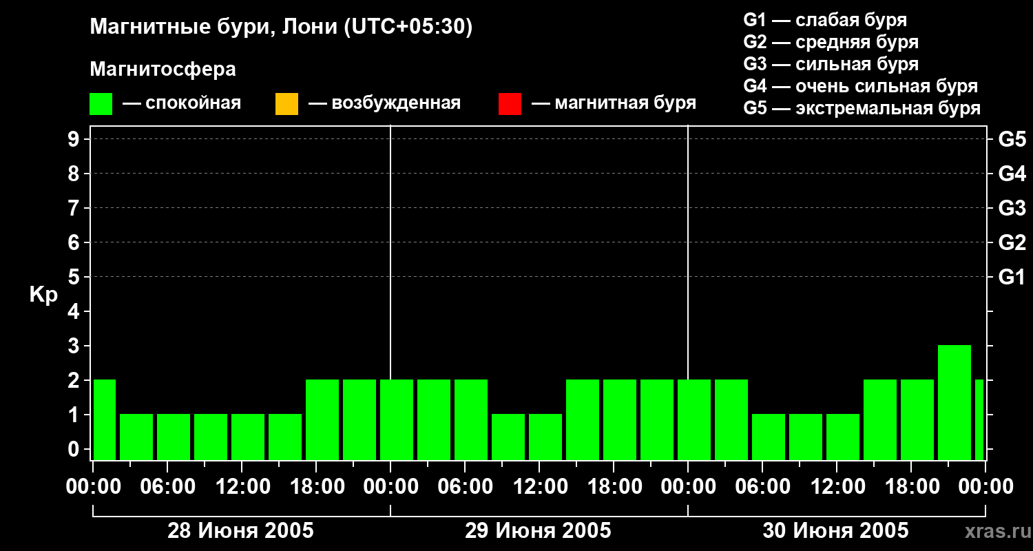 Изменения геомагнитного индекса Kp с 28 по 30 июня 2005 года для средних широт