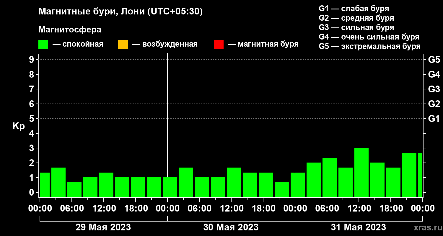 Изменения геомагнитного индекса Kp с 29 по 31 мая 2023 года для средних широт