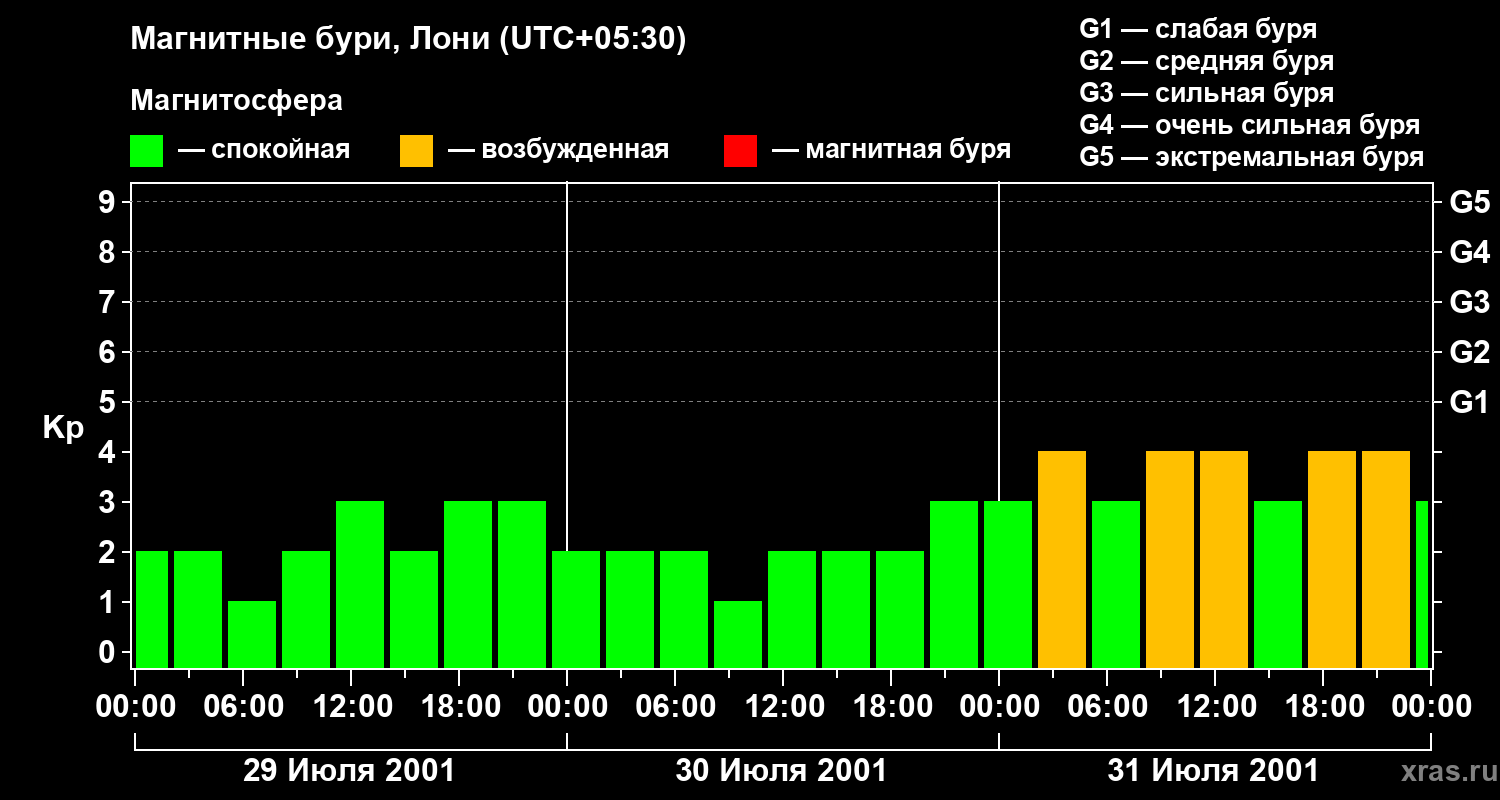 Изменения геомагнитного индекса Kp с 29 по 31 июля 2001 года для средних широт