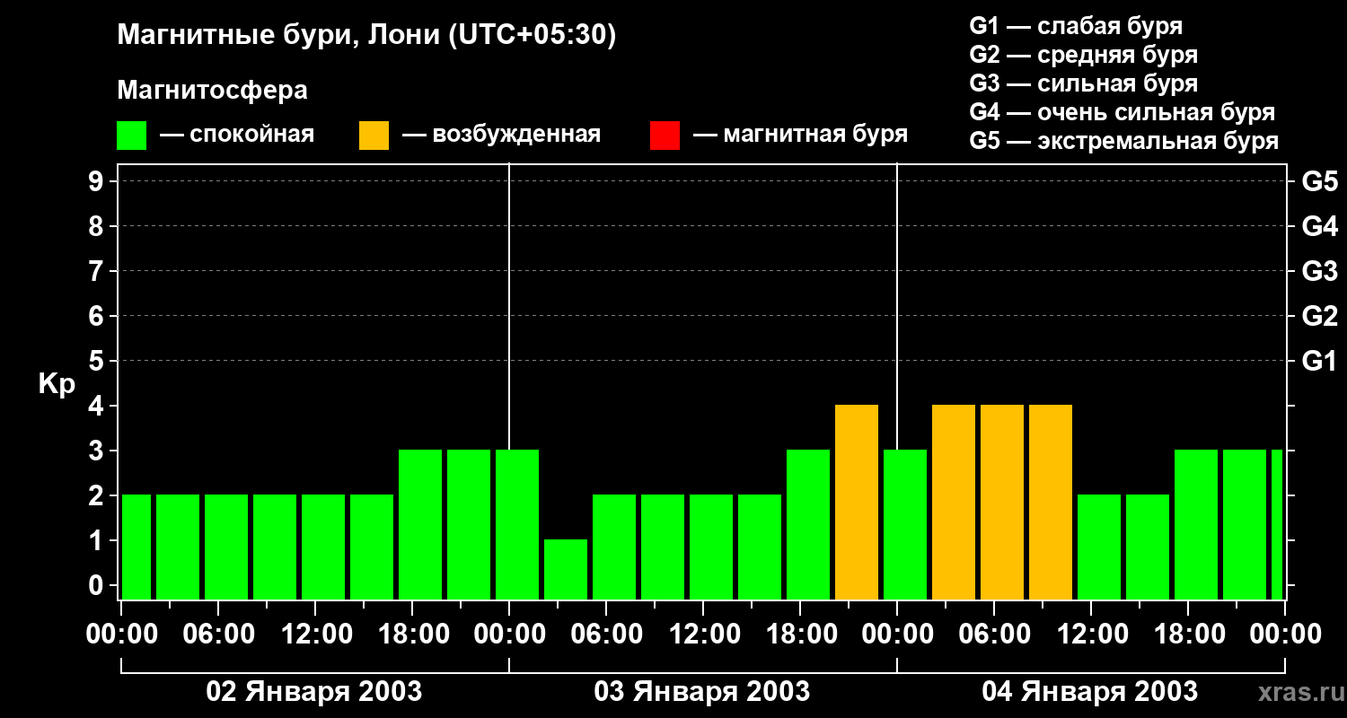 Изменения геомагнитного индекса Kp с 2 по 4 января 2003 года для средних широт