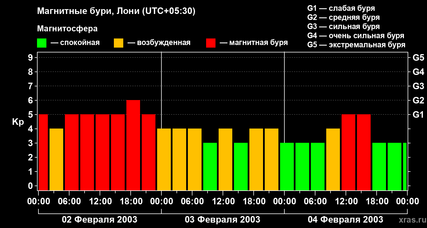 Изменения геомагнитного индекса Kp с 2 по 4 февраля 2003 года для средних широт