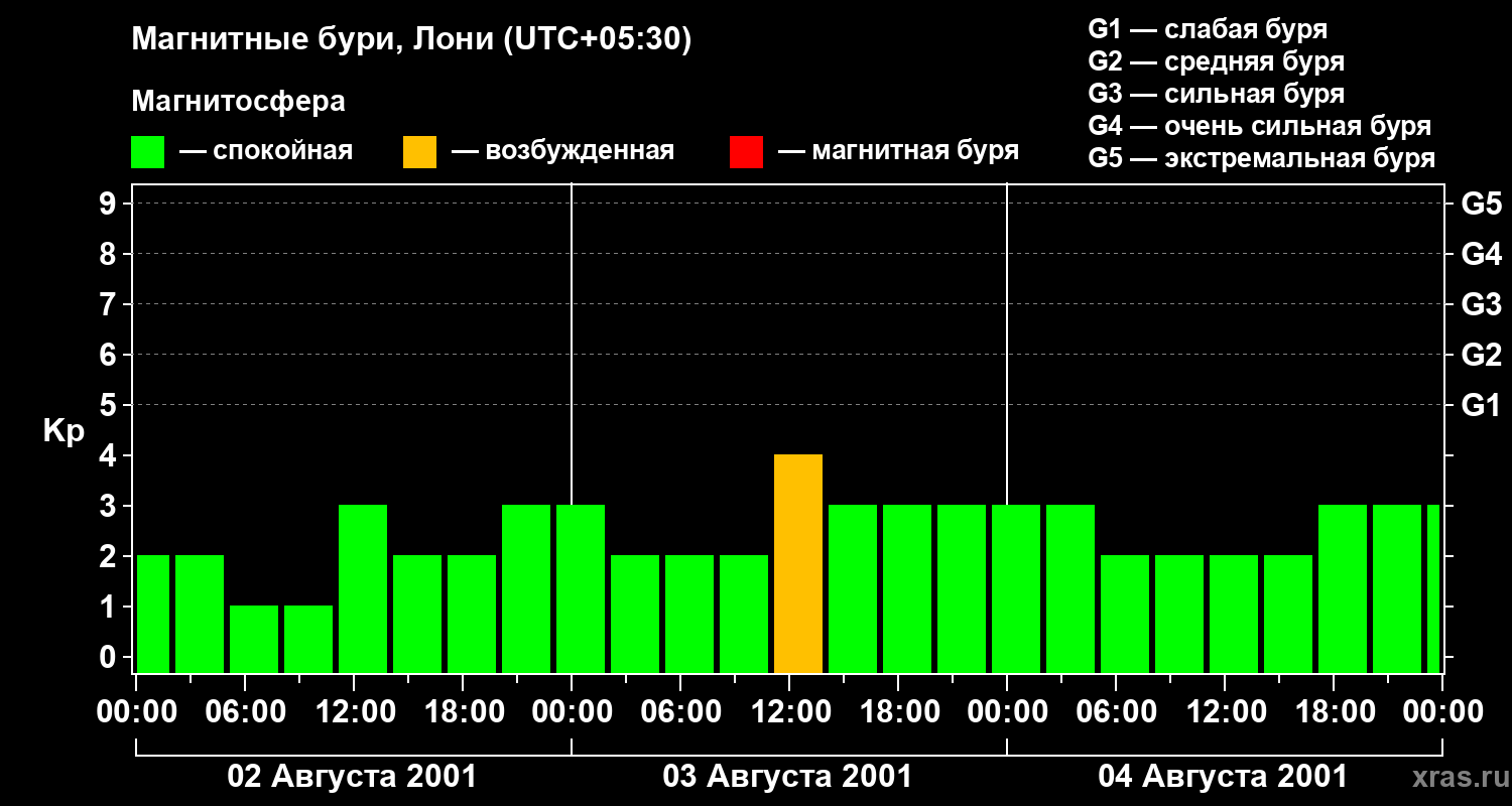 Изменения геомагнитного индекса Kp с 2 по 4 августа 2001 года для средних широт