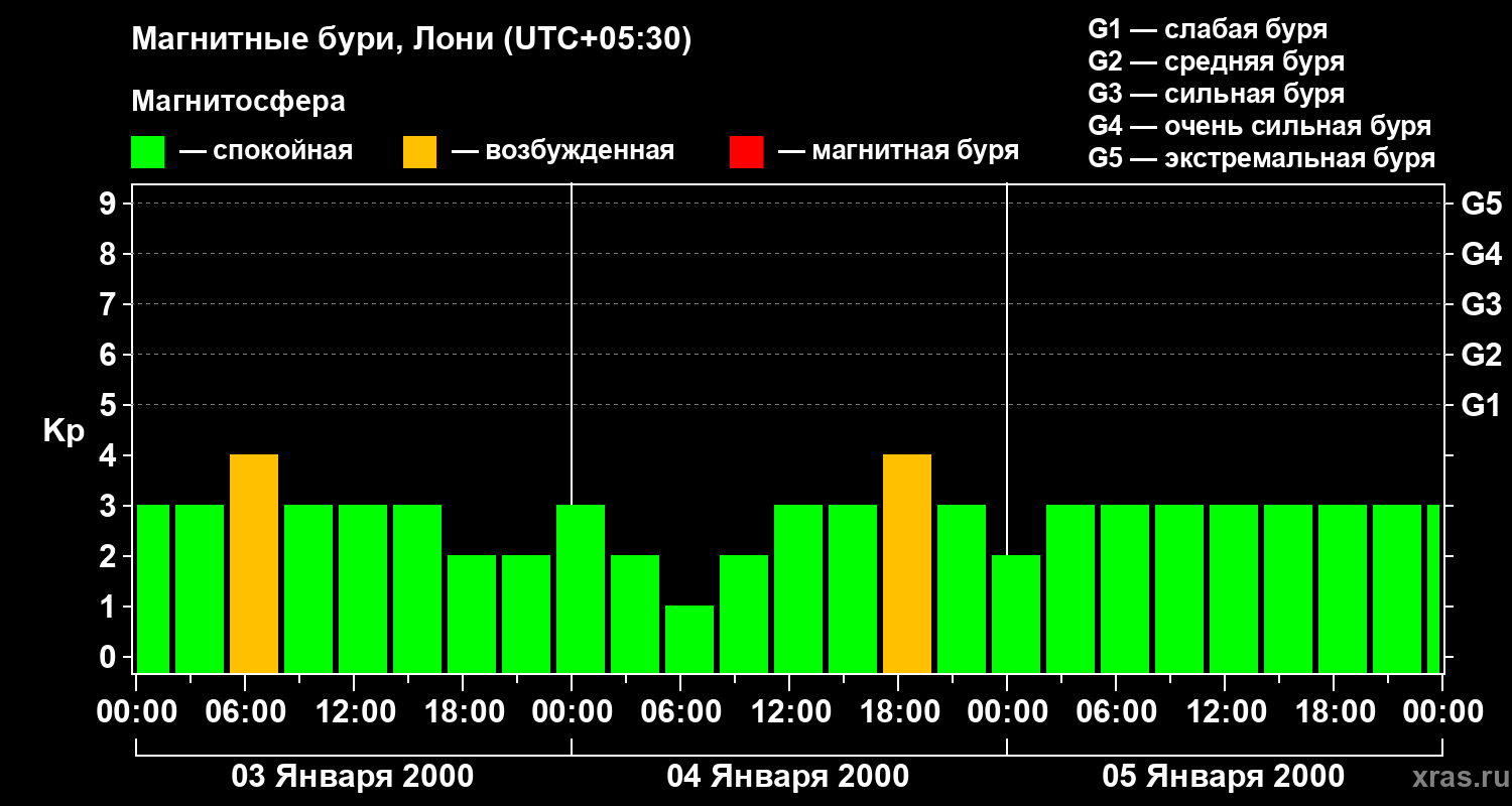 Изменения геомагнитного индекса Kp с 3 по 5 января 2000 года для средних широт