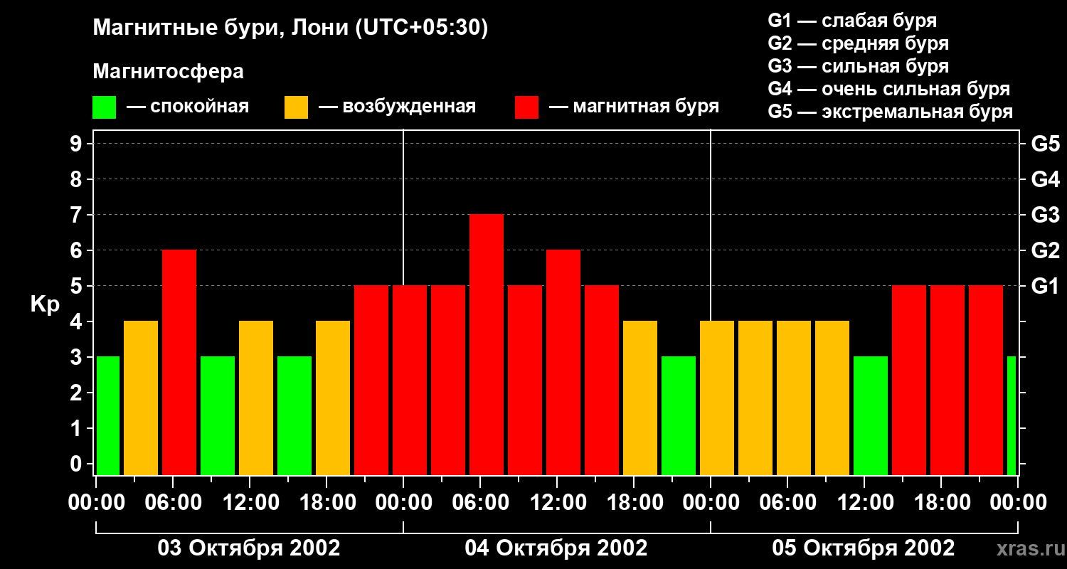 Изменения геомагнитного индекса Kp с 3 по 5 октября 2002 года для средних широт
