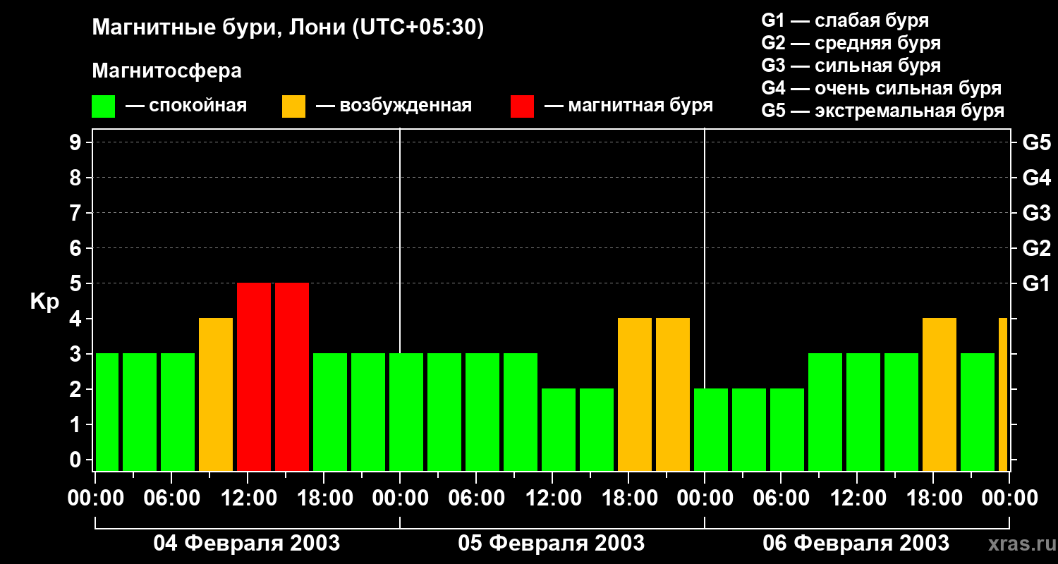 Изменения геомагнитного индекса Kp с 4 по 6 февраля 2003 года для средних широт